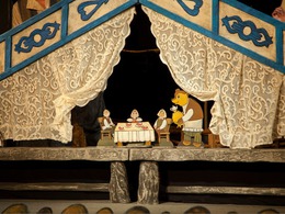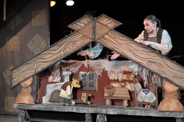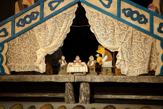Появится домик с покатой крышей, большие штоковые марионетки и куклы поменьше. И начнется сказка – про непослушную девочку Машу, которую избаловали Дед и Баба, про доброго Медведя, научившего девочку быть хозяйкой в доме: убирать, ставить самовар, печь пирожки.